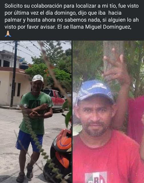 Puede ser una imagen de 2 personas y texto que dice "Solicito su colaboración para localizar a mi tío, fue visto por última vez el día domingo, dijo que iba hacia palmary y hasta ahora no sabemos nada, si alguien lo ah visto por favor avisar. EI se llama Miguel Domínguez, gh"