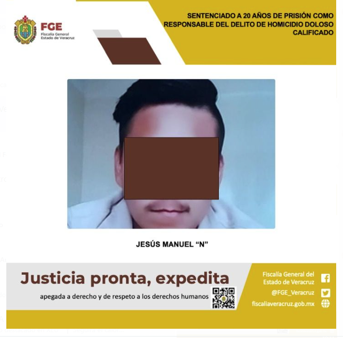 La Fiscalía General del estado de Veracruz informa Jesús Manuel “N” fue sentenciado a 20 años de prisión como responsable del delito de homicidio doloso calificado.