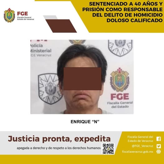San Andrés Tuxtla, Ver., 11 de julio 2025.- La Fiscalía General del Estado, a través de la Fiscalía Regional Cosamaloapan, logró sentencia condenatoria de 40 años de prisión en contra de Enrique “N” como responsable del delito de homicidio doloso calificado, cometido en agravio de la víctima identificada con las iniciales B.J.A.C. Los hechos ocurrieron en el municipio de Lerdo de Tejada, cuando la víctima, quien era perseguida por elementos de la Policía Municipal, fue privada de la vida con un arma de fuego, por el ahora sentenciado. El juez…