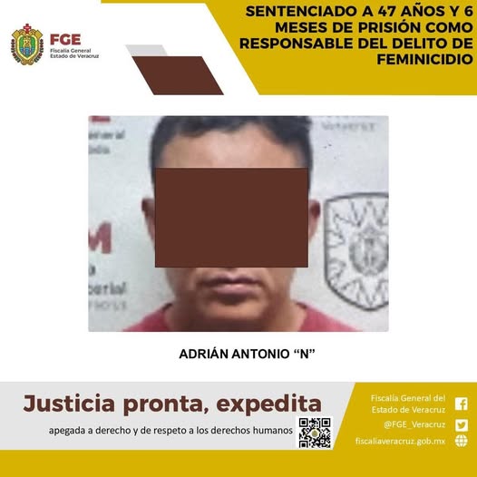 Xalapa, Ver., 11 de julio 2025.- La Fiscalía General del Estado, a través de la Fiscalía Coordinadora Especializada en Delitos contra las Mujeres, Feminicidio, Familia y Trata de Personas, logró sentencia condenatoria de 47 años y 6 meses de prisión en contra de Adrián Antonio “N” como responsable del delito de feminicidio, cometido en agravio de una víctima de identidad resguardada. Los hechos ocurrieron el 4 de julio de 2023, al interior del domicilio que el sentenciado compartía con la víctima, quien resultaba ser su esposa, cuando derivado de una…