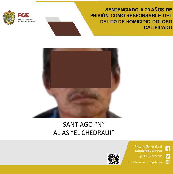 La Fiscalía General del estado i8nforma que Santiago “N” alias “El Chedraui” fue sentenciado a 70 años de prisión como responsable del delito de homicidio doloso calificado en Veracruz. Emite el siguiente comunicado