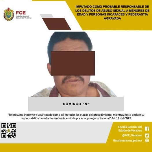 Ozuluama, Ver., 16 de marzo del 2025.-La Fiscalía General del Estado, a través de la Fiscalía Especializada en Investigación de Delitos de V1ol3ncia Contr4 la Familia, Mujeres, Niñas y Niños y de Trata de Personas, realizó imputación en contra de Domingo “N” como probable responsable de los delitos de 4bvso s3xv4l a m3nor3s de ed4d y personas incapaces y p3der4stia agrav4da, cometido en agravio de dos víctimas adolesc3ntes de identidad resguardada, quienes resultan ser sus hij4s.