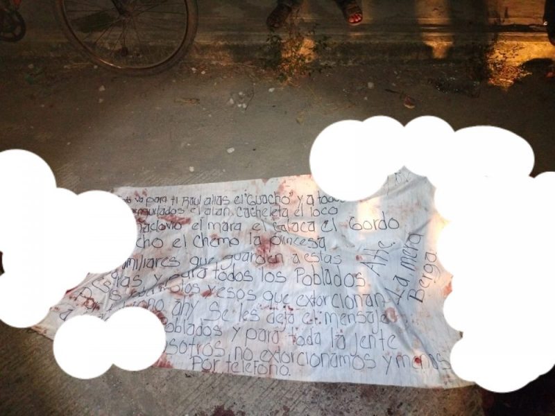 «Esto va para ti raul alias el guacho y a todos los igualados el Alan.cacheleta el loco ,el manclovio el mara, el calaca. El ocho , el chemo, la princesa, familiares que guarden a estas lacras y para todos los poblados esos roba motos . Y esos que extorsionan por teólofono hay se les deja el mensaje a todos los poblados y para todo la gente del C 17. Nosotros no extorcionamos y menos por teléfono».