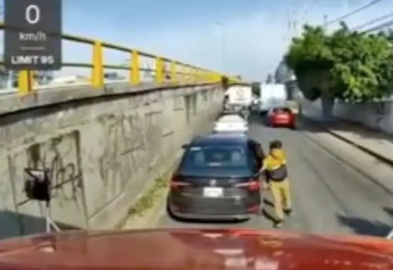 En el video, que dura alrededor de un minuto, se observa cómo el conductor del tráiler va manejando cuando, de pronto, un vehículo bloquea el paso del tractocamión.