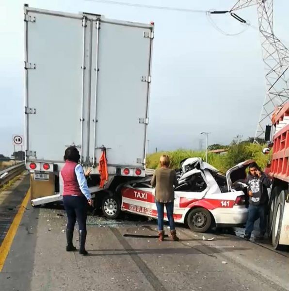 Trágico accidente se registró la mañana de este martes, luego de que un taxi del municipio de Fortín terminara prensado entre un tráiler con caja seca y camión de volteo.