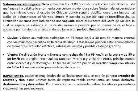 A través de su área de Meteorología,  informa la probabilidad de tormentas y lluvias fuertes a muy fuertes, así como viento del Norte y Noreste con rachas hasta de 65 km/h en costa.