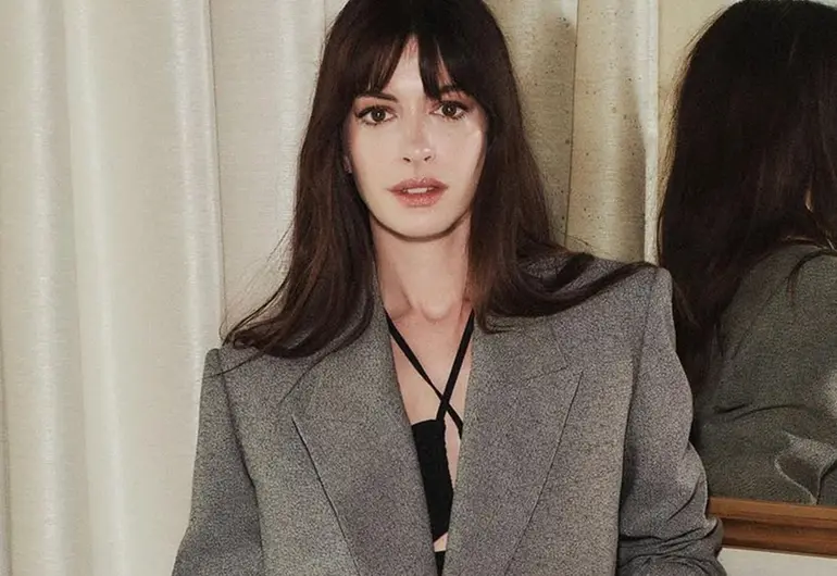 La actriz aparece con un conjunto sastre a rayas, chaleco y pantalón. Con este look, Anne Hathaway rinde homenaje al estilo de Andy, quien en la primera película debió adaptarse a la exigente vida en la revista Runway.