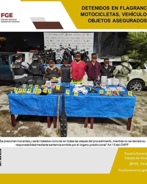 Catemaco, Ver., a 24 de septiembre del 2025.- La Fiscalía General del Estado informa que fiscales, peritos y policías ministeriales adscritos a la Fiscalía Regional Cosamaloapan, en coordinación con la Secretaría de la Defensa Nacional y la Secretaría de Seguridad Pública Estatal, llevaron a cabo un cateo autorizado por un juez en la colonia El Rodeo, ubicada en este municipio. En dicho operativo se detuvo en flagrancia a Francisco “N”, Ignacio Valentín “N”, Haphet “N”, Gustavo Anselmo “N” y Bartolo de Jesús “N”. Así mismo, se aseguraron pipas, bolsas de…