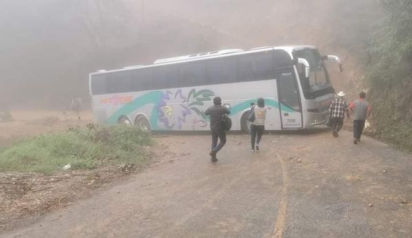Esta situación causó que una unidad de pasajeros de turismo se atascara al intentar pasar, lo cual quedó atravesado en la carretera impidiendo el paso a su vez en ambos sentidos de la reducida carretera.