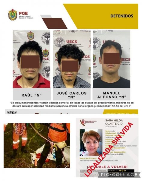 La Fiscalía General del Estado informa, que derivado de trabajos de investigación, elementos de la Policía Ministerial, detuvieron a Raúl “N”, Manuel Alfonso “N” y José Carlos “N”, este último sobrino de la víctima participación en la desaparición de Sara Hilda “N”, hechos suscitados en la ciudad de Xalapa.