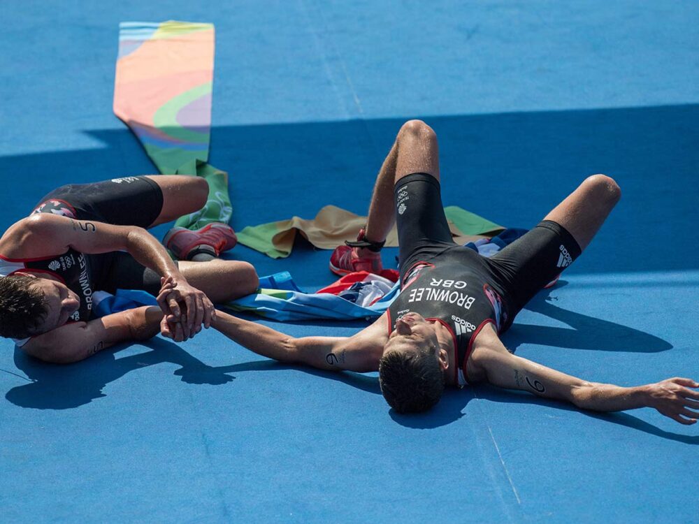 Alistair Brownlee recibió elogios cuando ayudó a su hermano mayor a cruzar la línea de meta cuando este último estaba agotado, durante las series mundiales de triatlón en México, en 2016. La imagen fue ampliamente compartida en redes sociales.