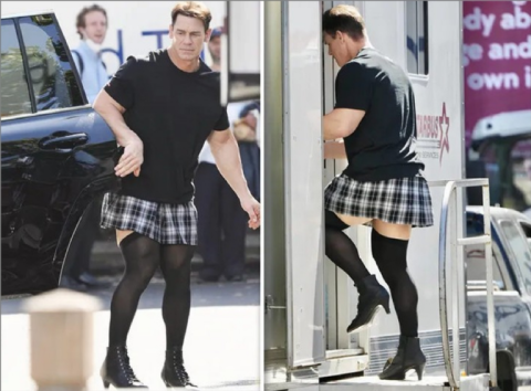 Y es que recientemente el luchador fue captado en plena vía pública usando una mini falda, medias negras y tacones. En las fotografías se puede observar como John Cena desciende de un vehículo y en la otra se le aprecia entrando a lo que parece ser un camper.