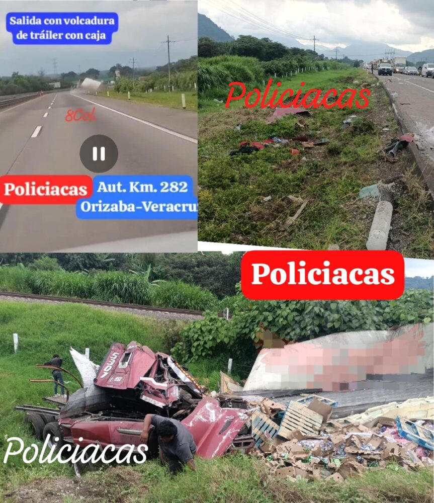 Autopista Cd. Mendoza – Córdoba, km 282, dirección Córdoba. Reducción de carriles por atención de accidente (salida del camino de tracto camión). Maneja con precaución