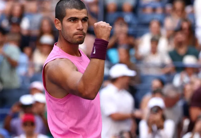 De nuevo por la vía rápida, el español Carlos Alcaraz venció el domingo al francés Arthur Rinderknech y se metió en los cuartos de final del US Open, donde rompió de paso otra marca de precocidad.