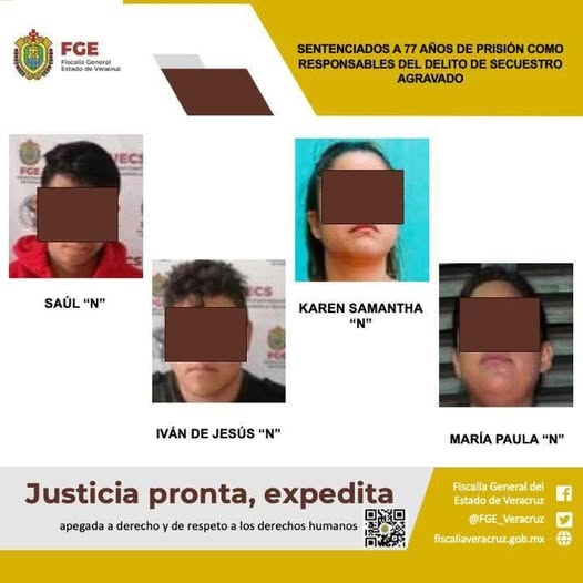 *Los hechos en Acultzingo Veracruz Córdoba, Ver., 5 de julio de 2025.-La Fiscalía General del Estado, a través de la Unidad Especializada en Combate al Secuestro, logró sentencia condenatoria de 77 años de prisión en contra de Saúl “N” , Iván de Jesús “N”, Karen Samantha “N” y María Paula “N”, como responsables del delito de secuestro agravado, cometido en agravio de la víctima identificada con las iniciales B.A.C.F. Los hechos ocurrieron el 19 de febrero de 2021 en el municipio de Acultzingo, cuando la víctima se encontró con Karen…