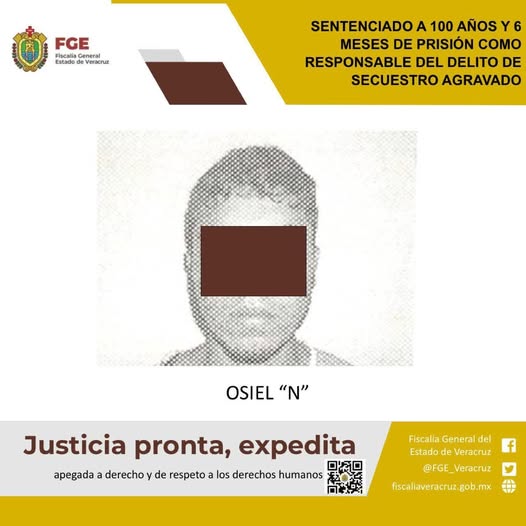 Tuxpan, Ver., a 27 de junio del 2025.- La Fiscalía General del Estado, a través de la Fiscalía Regional Tuxpan, logró sentencia condenatoria de 100 años y 6 meses de prisión en contra de Osiel “N” como responsable del delito de secuestro agravado en agravio de las víctimas identificadas con las iniciales J.L.R., M.A.R.G., U.V.L., M.E.L., A.N.D. y R.V.S. El juez además de dictar sentencia, estableció un pago por concepto de reparación del daño y suspendió sus derechos civiles y políticos, dentro de la causa penal 573/2017.
