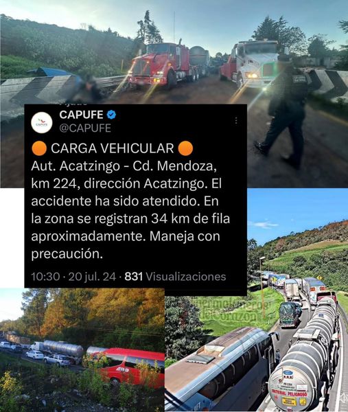 Aut. Acatzingo – Cd. Mendoza, km 224, dirección Acatzingo. El accidente ha sido atendido. En la zona se registran 34 km de fila aproximadamente. Maneja con precaución.