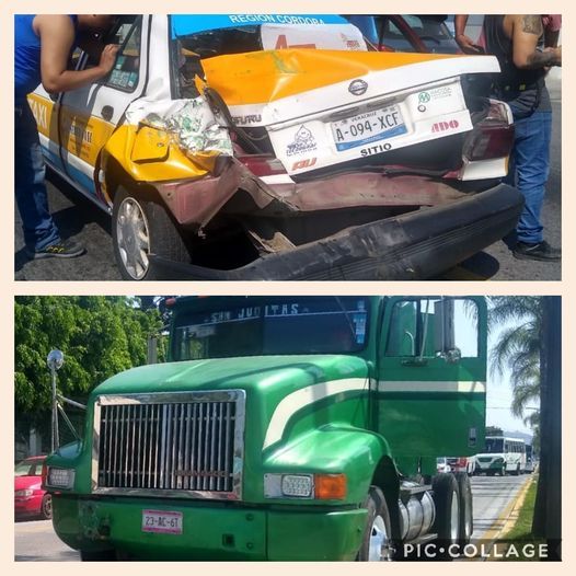 CÓRDOBA VER.- Este miércoles se registró aparatoso choque en esta ciudad, luego de que se impactara un tractocamión contra un automóvil de servicio de taxi