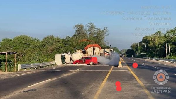 Un accidente automovilístico causa cierre sobre la carretera Jáltipan-Acayucan a la altura de la colonia El zacatal, en el que se ven involucrados un tractocamión, un auto sedán y una pipa de gas LP, reporta la Secretaría de Protección Civil, subrayando que la zona se mantiene acordonada.