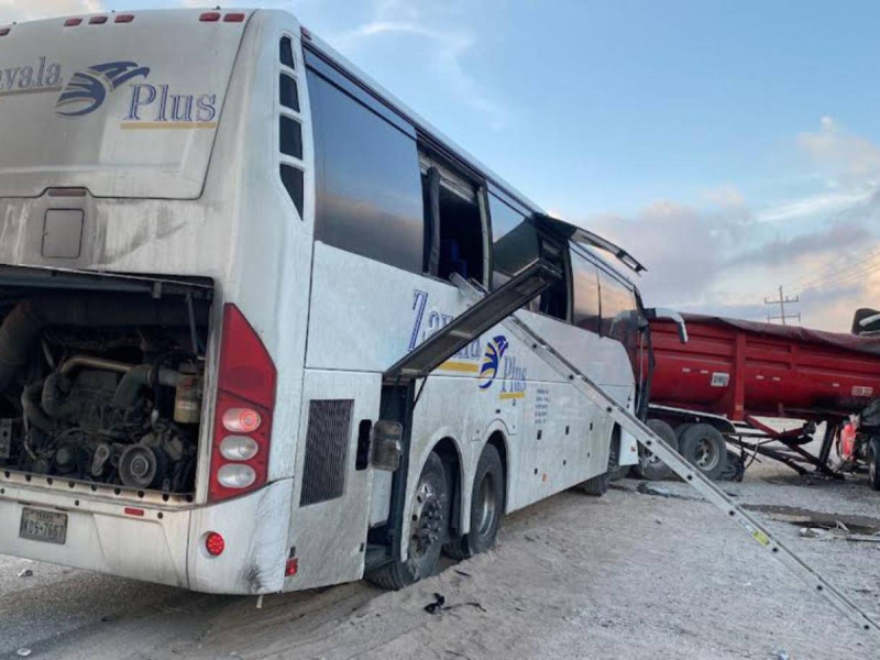 El autobús de una empresa privada de turismo de la empresa Zavala Plus, procedente de Dallas, Texas, se proyectó contra la pesada unidad, perdiendo la vida de manera inmediata.