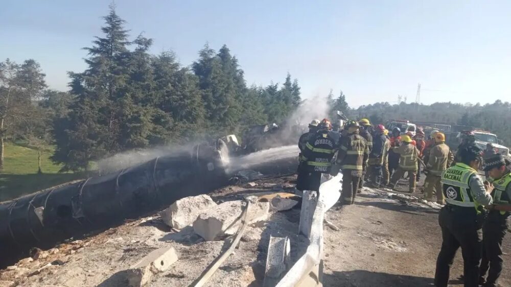 Fuerzas de tarea de Guardia Nacional, PC Estatal y municipal, SSP, Bomberos de Xalapa, ENR y COPEXA continúan con las labores de enfriamiento tras el incendio de un tractocamión tipo pipa ocurrido en la autopista Perote – Xalapa.
