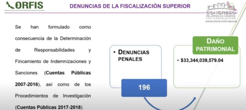 La  auditora general del Órgano de Fiscalización Superior, (Orfis),  Delia González Cobos, informó que se han formulado un total de 196 denuncias penales por un presunto daño patrimonial de 33 mil millones de pesos de 2007 a 2018.