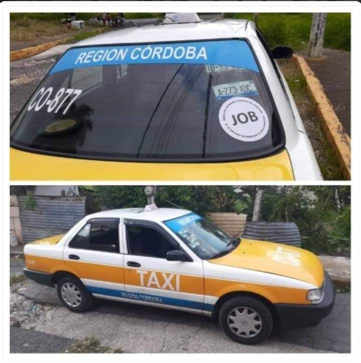 El taxi es un Tsuru de color amarillo con blanco, con placas de circulación A-273-XDC y número económico CO-877.