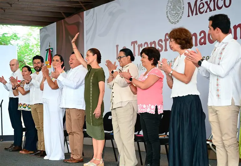 “Ya la iniciamos, ya se está construyendo la línea del Tren Maya que va a Puerto Progreso, y además estamos invirtiendo entre el estado y la federación para ampliar el Puerto Progreso, para el desarrollo de Yucatán y un área muy especial para el desarrollo industrial de Yucatán. Es una visión de largo plazo, que es parte del renacimiento maya”, detalló la presidenta.