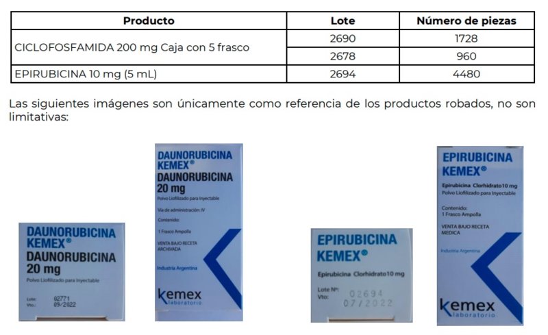 La COFEPRIS fue notificada el pasado 7 de octubre del presente, sobre un robo ocurrido en las instalaciones de la empresa NOVAG INFANCIA, S.A. DE C.V., de diversos productos, entre ellos medicamentos oncológicos fabricados por la empresa LABORATORIO KEMEX, S.A., y distribuidos por la empresa NOVAG INFANCIA, S.A. DE C.V.