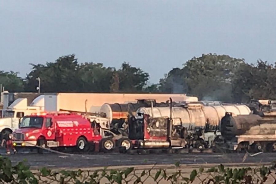 Al menos cuatro tráileres y una unidad de carga fueron consumidos por el fuego tras darse un fuerte incendio en un patio que los resguarda en la comunidad de Santa Fe, municipio de Veracruz.