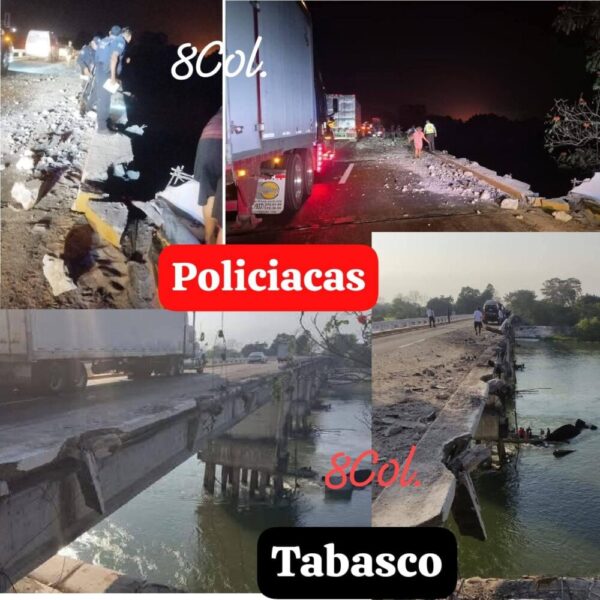 TABASCO. (8Col,)01/05/2025.- Un trágico accidente fue reportado durante la madrugada de este jueves , en la carretera Cárdenas -Villahermosa, a la altura del km. 132+500, en donde se registró la salida y caída de puente al caudaloso río Samaria de un tráiler con caja seca cargado con al parecer productos de abarrotes.