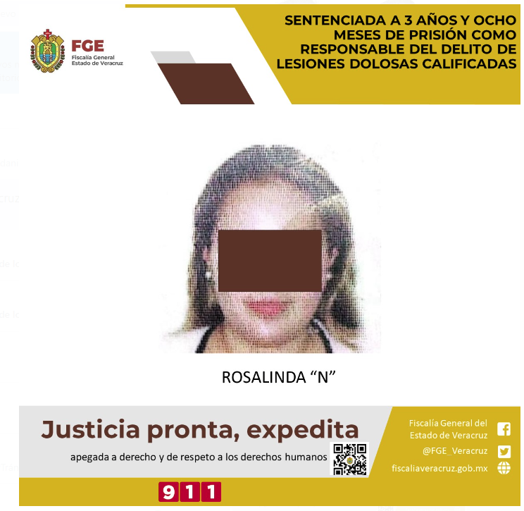 La Fiscalía General del estado informa que Rosalinda “N” fue sentenciada a tres años y ocho meses de prisión como responsable del delito de lesiones dolosas calificadas a dos personas, ocasionadas con una piedra.