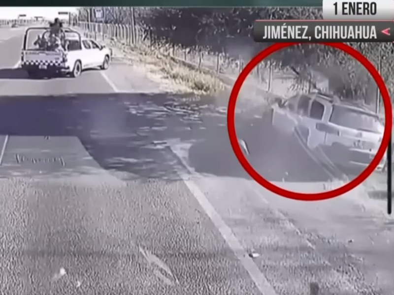 A través de un video captado por la cámara de seguridad de un tráiler, se registró el momento en que el personal de la Guardia Nacional dispara en contra de los tripulantes de una camioneta, que sale del camino, hacia la derecha.