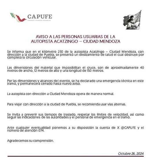 MALTRATA. VER. (8Col.)26/10/2024.- Debido al derrumbe (deslizamiento)de un talud, la carretera permanecerá cerrada hasta nuevo aviso informa CAPUFE, en uno de sus comunicados difundido en sus #redessociales .