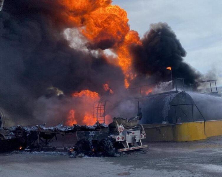 Un incendio en tres cilindros estacionarios de 50 mil litros de diésel y dos tráileres movilizaron esta tarde a elementos de Protección Civil de Nuevo León.