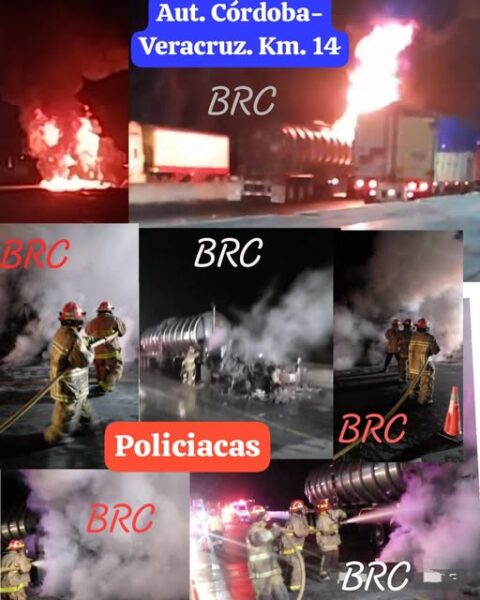 El heroico cuerpo de Bomberos Regionales de Cuitláhuac al mando del Cmdte. Cambambia más 6 elementos voluntarios realizan las labores de control extinción del fuego que se inicio en el tractor de la pipa la cual terminó reducida a escombros.