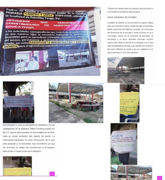 La falta de cumplimiento de parte de funcionarios de la SEV a la obra de una escuela digna en la localidad de Palmillas, precisamente a la escuela primaria Campos y López, perteneciente al municipio de Yanga Veracruz, ha provocado una serie de malestar.