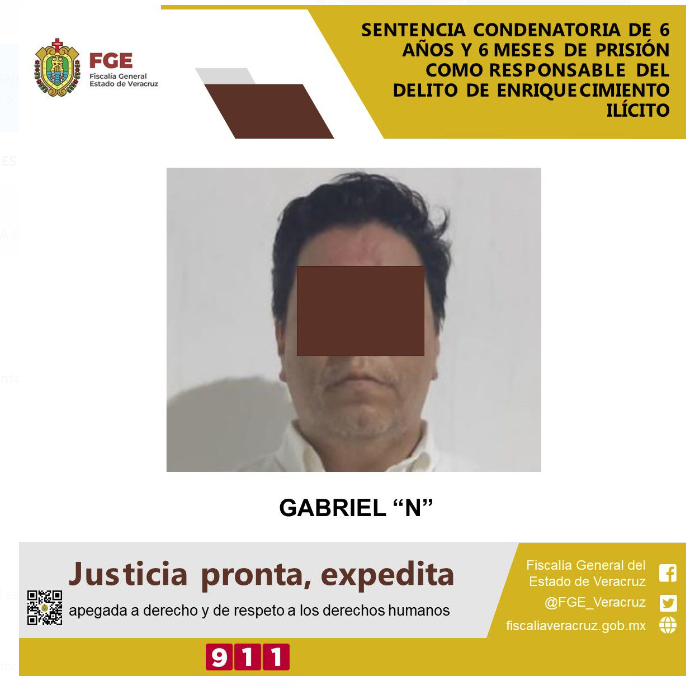 La Fiscalía General del Estado informa en un comunicado que obtuvo sentencia condenatoria de seis años y seis meses de prisión en contra del ex funcionario de la administración estatal de Javier Duarte, Gabriel “N”.