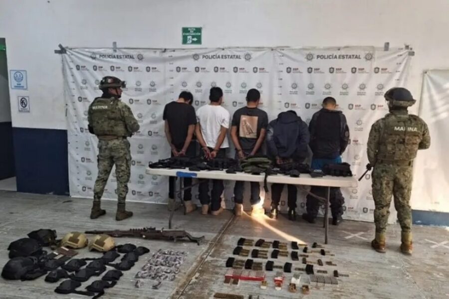 Estas acciones se llevaron a cabo durante recorridos de disuasión y vigilancia en los que se visualizaron personas armadas circulando a bordo de dos camionetas, por lo que personal naval en coadyuvancia con personal de la SSP de Veracruz, procedieron a llevar a cabo la detención de cinco personas, así como el aseguramiento de cinco armas de diferentes calibres, cinco fusiles, 650 cartuchos, 18 cargadores, equipo táctico, dos vehículos y 27 bolsas de plástico transparente las cuales contenían hierba seca con características similares a la marihuana.