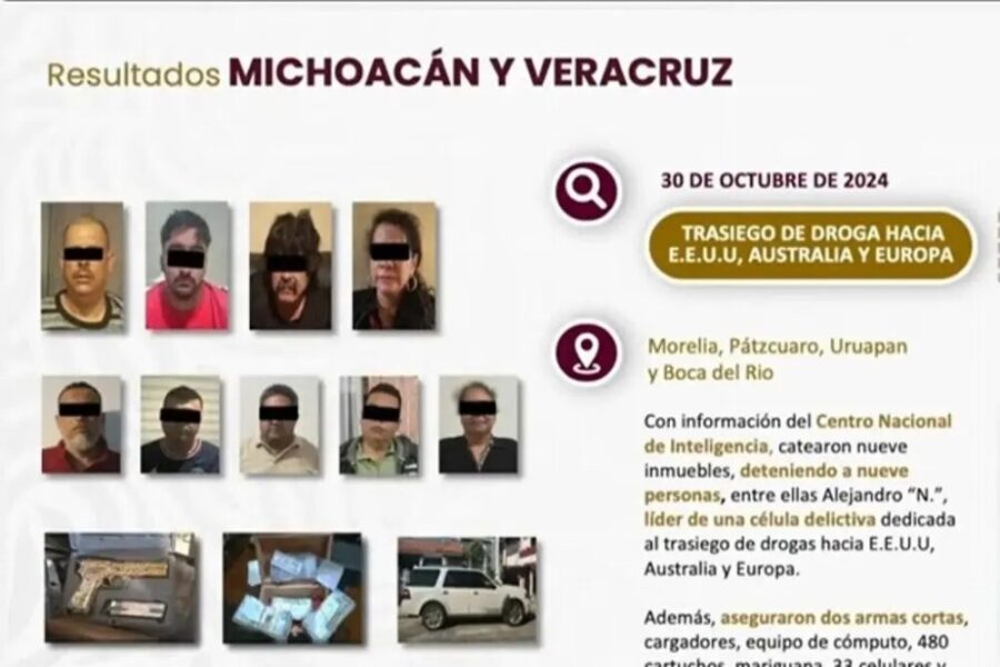 El secretario de Seguridad, Omar García Harfuch, destacó este martes el desmantelamiento a una red intercontinental de tráfico de droga en Michoacán y Veracruz.