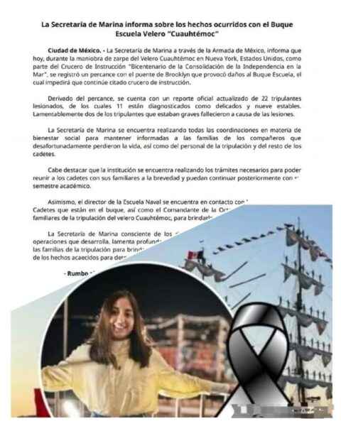 Una cadete de la Heroica Escuela Naval Militar de Antón Lizardo, nacida en la ciudad de Xalapa, perdió la vida en el accidente que protagonizó el buque escuela “Cuauhtémoc” en la ciudad de Nueva York la noche del sábado 17 de mayo durante las maniobras de zarpe para dirigirse a Reikiavik, Islandia.