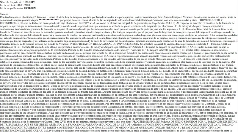 En el acuerdo publicado este miércoles 8 de enero, sobre el expediente 1172/2019, se indica que se notifica por lista de acuerdos a la parte quejosa, la determinación del dos de enero, que señala que “vista la demanda de amparo” promovida por el Marcos Even “N”, “por propio derecho, contra el acto de la Encargada de la Fiscalía General del Estado de Veracruz, con sede en esta ciudad y otros. FÓRMESE JUICIO Y REGÍSTRESE en el Libro de Gobierno correspondiente bajo el número 1172/2019-VI-A, así como en el Sistema Integral de Seguimientos de Expedientes (S.I.S.E).”