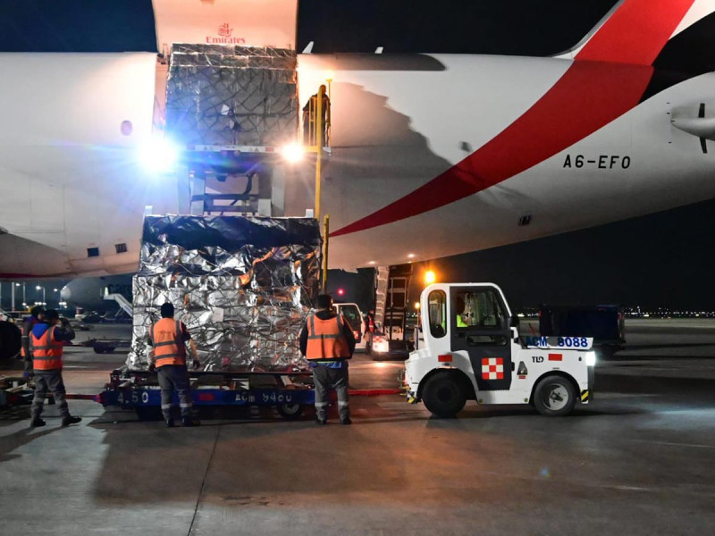 Las vacunas llegaron al Aeropuerto Internacional Felipe Ángeles en un vuelo de Emirates, según se observa en el video compartido en la cuenta @SSalud_mx.