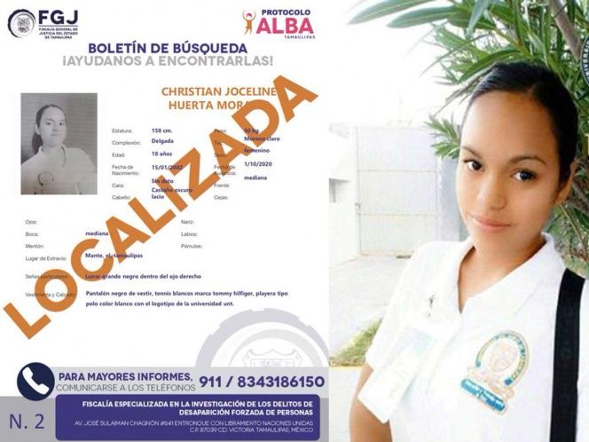 La Fiscalía General de Justicia del Estado de Tamaulipas informa que, derivado de las acciones coordinadas de búsqueda este día fue localizada con vida y en perfecto estado de salud, Christian Joceline Huerta Morales”, se informó en un comunicado.