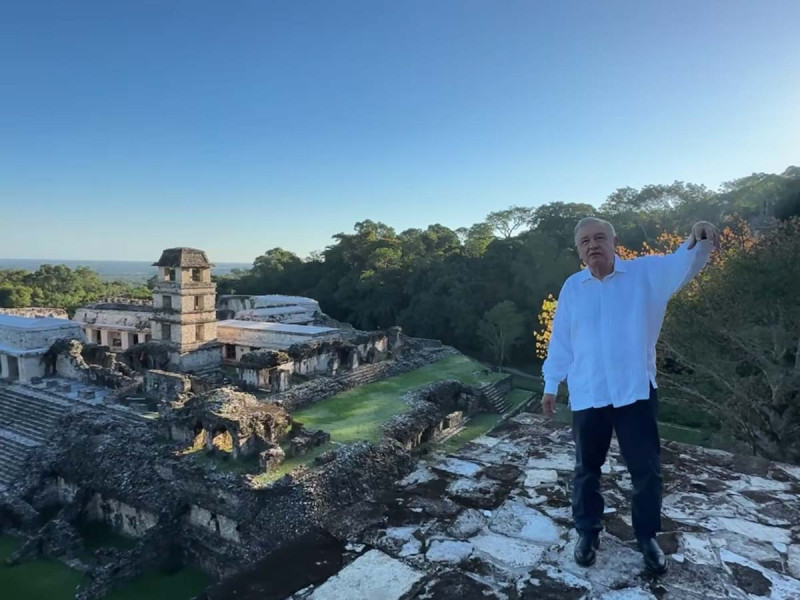 “Estoy en Palenque, aquí amanecí, en el Templo de las Inscripciones, aquí abajo está la tumba, el palacio, en el fondo el Templo de la Cruz Foliada, ese cerro que de joven, cuando estudiaba en la Facultad de Ciencia Política, lo escalé, es una plataforma, es una de las capitales de la gran nación maya”, explicó el mandatario.