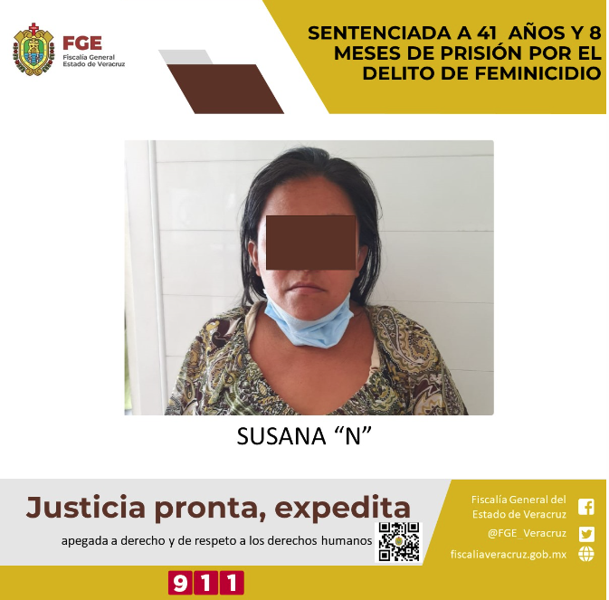 Papantla, Ver. La Fiscalía Especializada en Investigación de Delitos de Violencia Contra la Familia, Mujeres, Niñas y Niños y Trata de Personas logró sentencia condenatoria de 41 años y 8 meses de prisión en contra de Susan “N” por el delito de feminicidio.