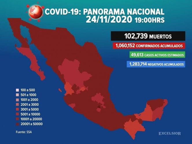 Autoridades de la Secretaría de Salud informaron que el número de muertos por coronavirus covid-19 en México llegó a 102 mil 739, mientras que los casos confirmados alcanzan 1 millón 60 mil 152.