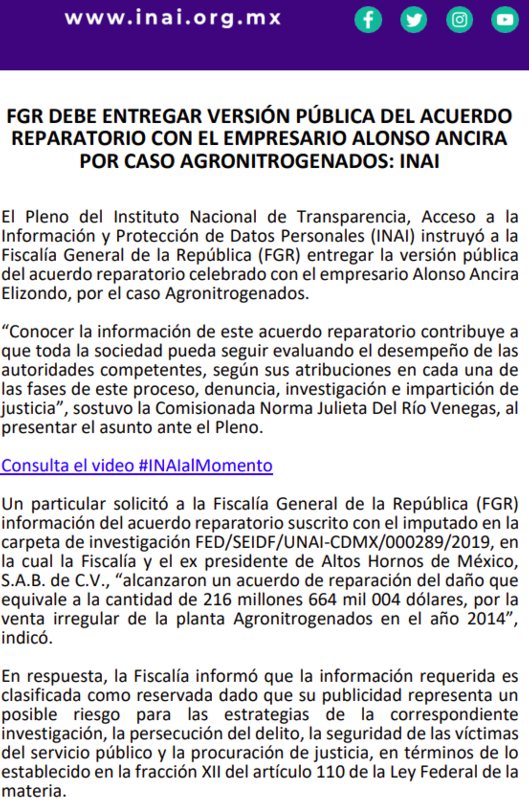 La instrucción surgió luego de que un particular solicitó a la FGR información del acuerdo reparatorio suscrito con Ancira en la carpeta de investigación FED/SEIDF/UNAI-CDMX/000289/2019, según el cual la Fiscalía y Ancira “alcanzaron un acuerdo de reparación del daño que equivale a la cantidad de 216 millones 664 mil 004 dólares, por la venta irregular de la planta AgroNitrogenados en el año 2014”, de acuerdo con un comunicado del INAI.