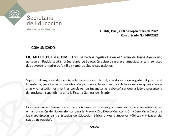 Fue denunciado el presunto abuso sexual de una niña de segundo grado del Jardín de Niños Federal Amalucan, por el intendente del plantel, el pasado 5 de septiembre.