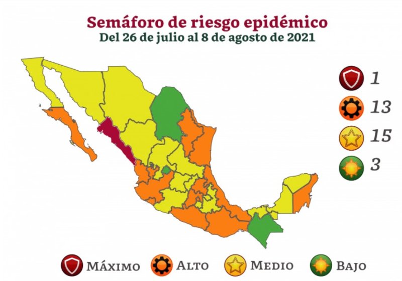 La Secretaría de Salud dio a conocer este viernes el semáforo epidemiológico vigente del 26 de julio al 8 de agosto.
